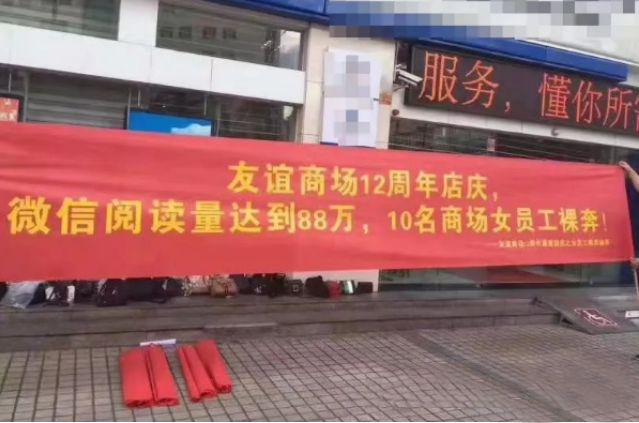 原來是海口龍華區(qū)的一家商場(chǎng)正值12周年慶搞活動(dòng),掛出了“微信閱讀達(dá)88萬,10名商場(chǎng)女員工裸奔”的橫幅,這橫幅一出果然引來不少人的關(guān)注、博取到不少外界的眼球,只是大家關(guān)注的是其低俗、無下限宣傳內(nèi)容,并且聲音都是一面倒的對(duì)其行為進(jìn)行指責(zé)。而隨后該商場(chǎng)也因?yàn)檫@次低俗的宣傳被??谑袐D聯(lián)、龍華區(qū)婦聯(lián)、龍華區(qū)城管大隊(duì)等各方機(jī)構(gòu)進(jìn)行了處罰和批評(píng)教育。